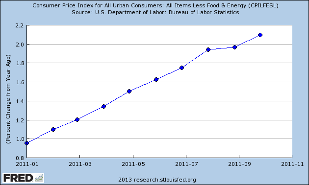 Below cpi data for 2011 is seen. Gross cpi crosses 2.0 in February creating an uptrend in TLT. Later in August, core cpi crosses 1.94 and the twist is implemented. Notice both trends are up.