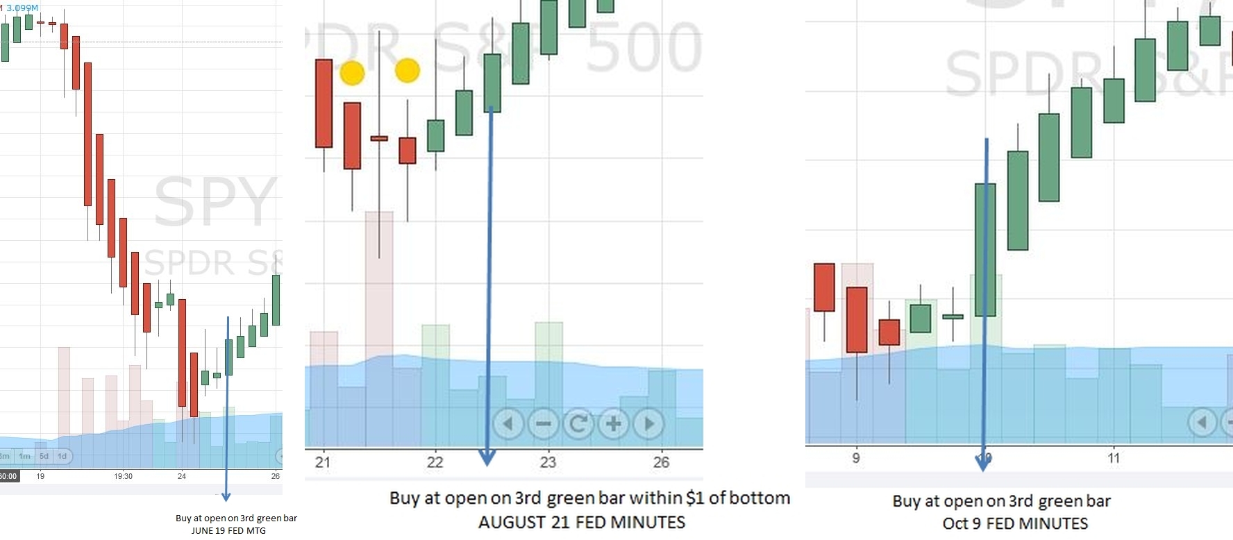 Use SPY and 2h Heiken Ashi candles. You have the usual Lo-Hi line and Open-Close filled box. I see that the 3rd green candle at the open of the 2h period is a great time to enter AFTER the Fed event. Any reds and you stay cash.