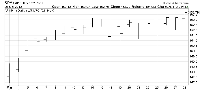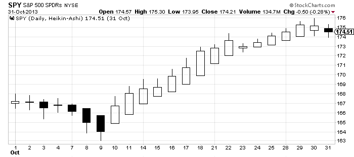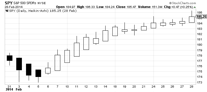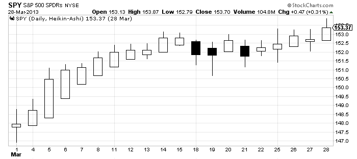 I looked closer at the behavior of SPY when the VIX was as low as now (Mar 2013). In this period, ccpi was 2.0 but still a low VIX would indicate a low rebound opportunity as sure enough looking at the charts HA and bar charts….