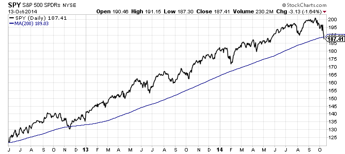 Yesterday could be bottom based on the 200 dma crossing… -$1.60 below the 200dma same as Nov 2012. Rebound could start today… BUT target would be 196 by Oct 31 on this basis! It will be a slow moving rebound. On the plus side…no fiscal cliff to worry about here though and inflation very low and falling so new QE can be announced. However, Nov 2012 was also when new QE was announced.