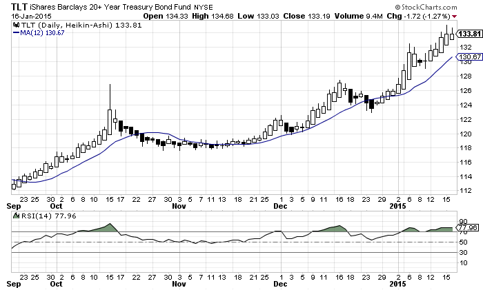 For now TLT is heavily OB (overbought). Will most likely rise; however pullback will be strong with such an OB condition. It’s better to wait for RSI 60. See most recent TLT runs (Sep 22, Dec 8, Dec 30).
