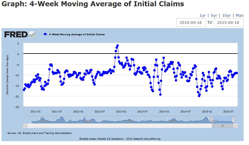 Unemployment claims are fine and economy OK (from Fed point of view). Below is % change in UIC from 1 year ago.