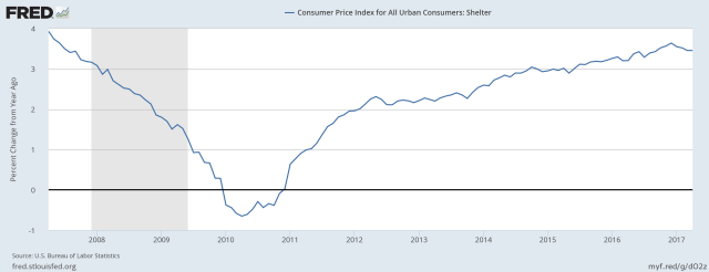 The last 2 months had low core inflation Mar (-0.1) and Apr (0.1) but it will revert back to mean of 0.183. Core inflation has been driven higher by obamacare and rent (shelter). These trends are strong and will continue until next recession 2019-2020 which is still far away:
