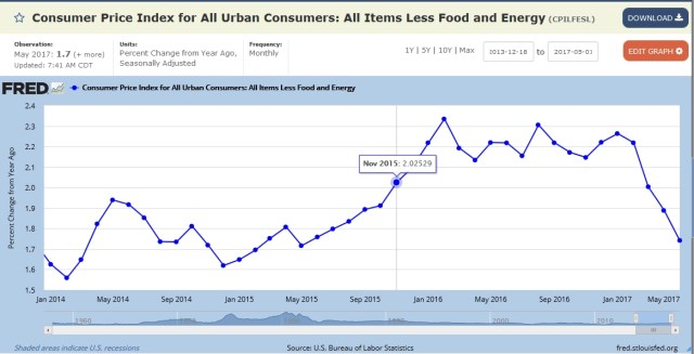 Core inflation is at its lowest 1.74 (need 2.0). The Fed inflation forecast is bad. In January, they talked of rising inflation and in March when rates went up last time: