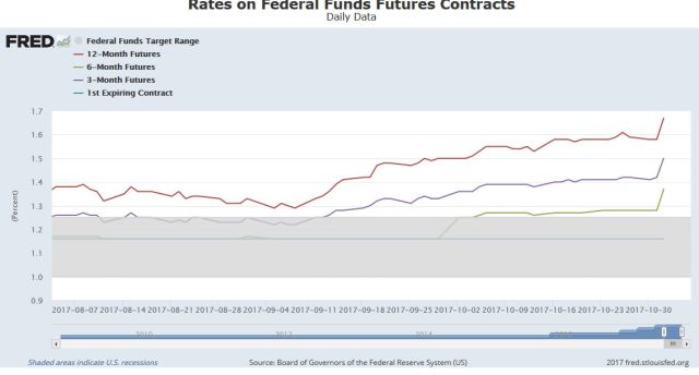 In the last week, Fed Futures rise rapidly indicating a more aggressive Fed in Dec!