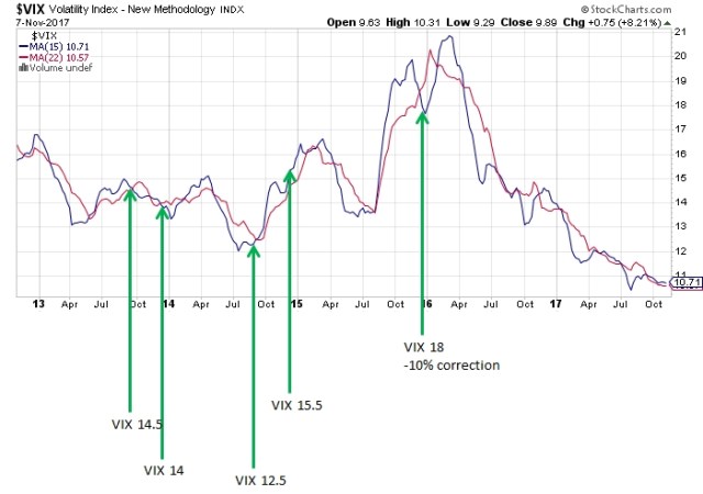 VIX has nowhere to go but up as it has bottomed. Expect 12-14 range of VIX 15wkma next year as the Fed will keep raising rates and the USD strengthens.