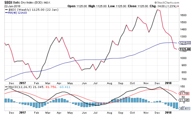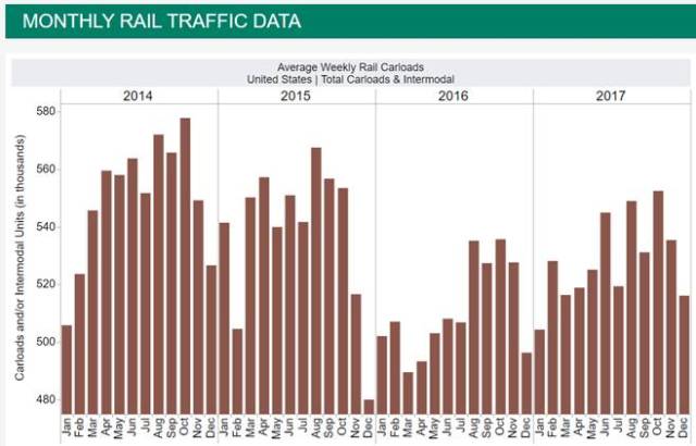 Now that a recession is approaching…BDI can be useful and rail data (somewhat). Near term Jan shows a greater downturn MACD (-60) than 2017 (-30) , black line (21) than 2017 (150) and ROC (36) than 2017 (150).