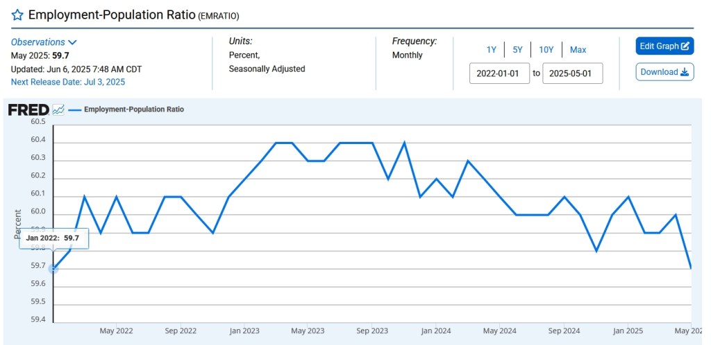 Labor force has been shrinking and empl to population ratio has dropped to 59.7