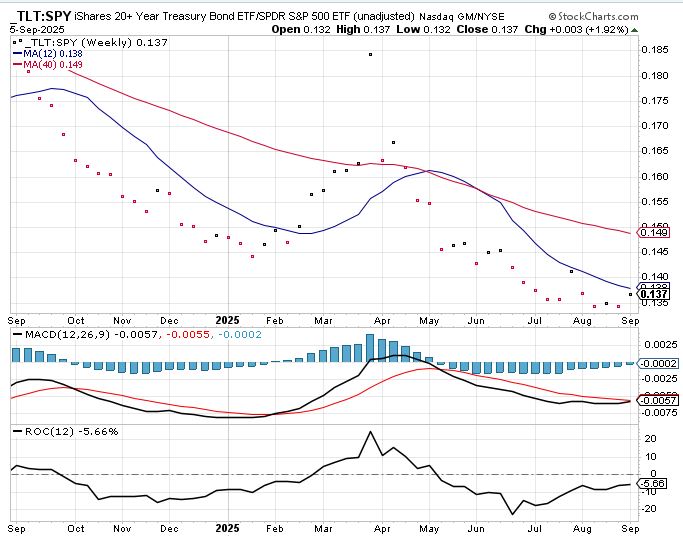 5 RHA bars on 1 year Treasury corresponds to declining momentum on SPY as seen in flat macd bars
